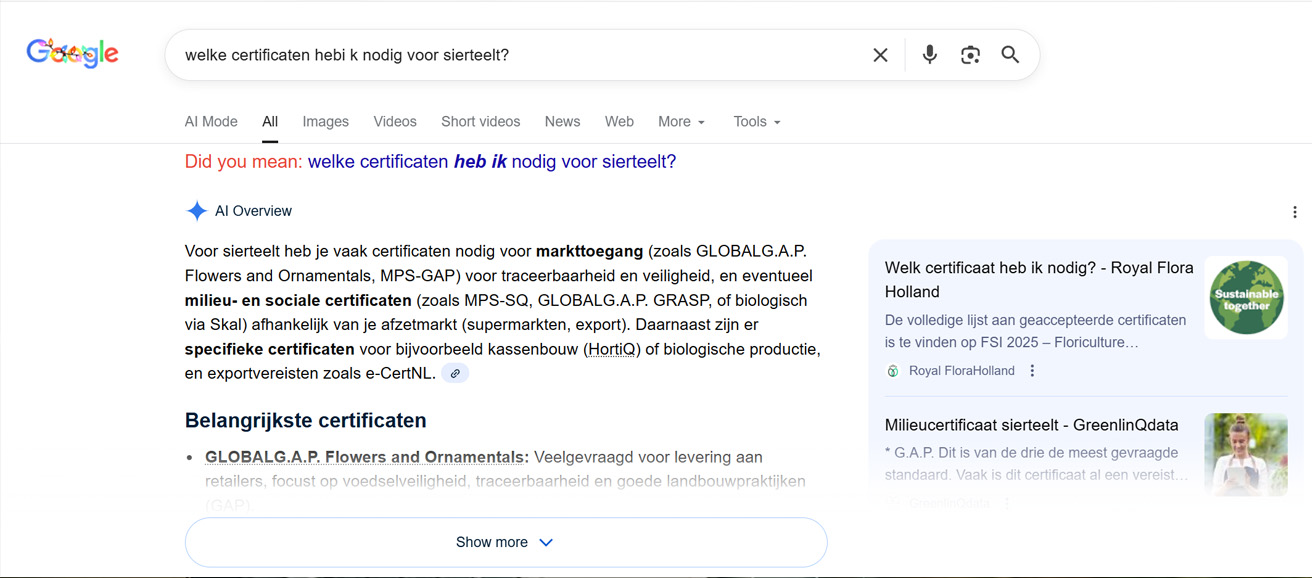 Voorbeeld: “Controleer voor deze order de MPS-certificaten van de drie genoemde kwekers voor volgende week.” De AI-agent maakt verbinding met de MCP-server van Floricode, kiest de juiste “vaardigheid”, haalt de relevante gegevens op en geeft jou een helder antwoord.