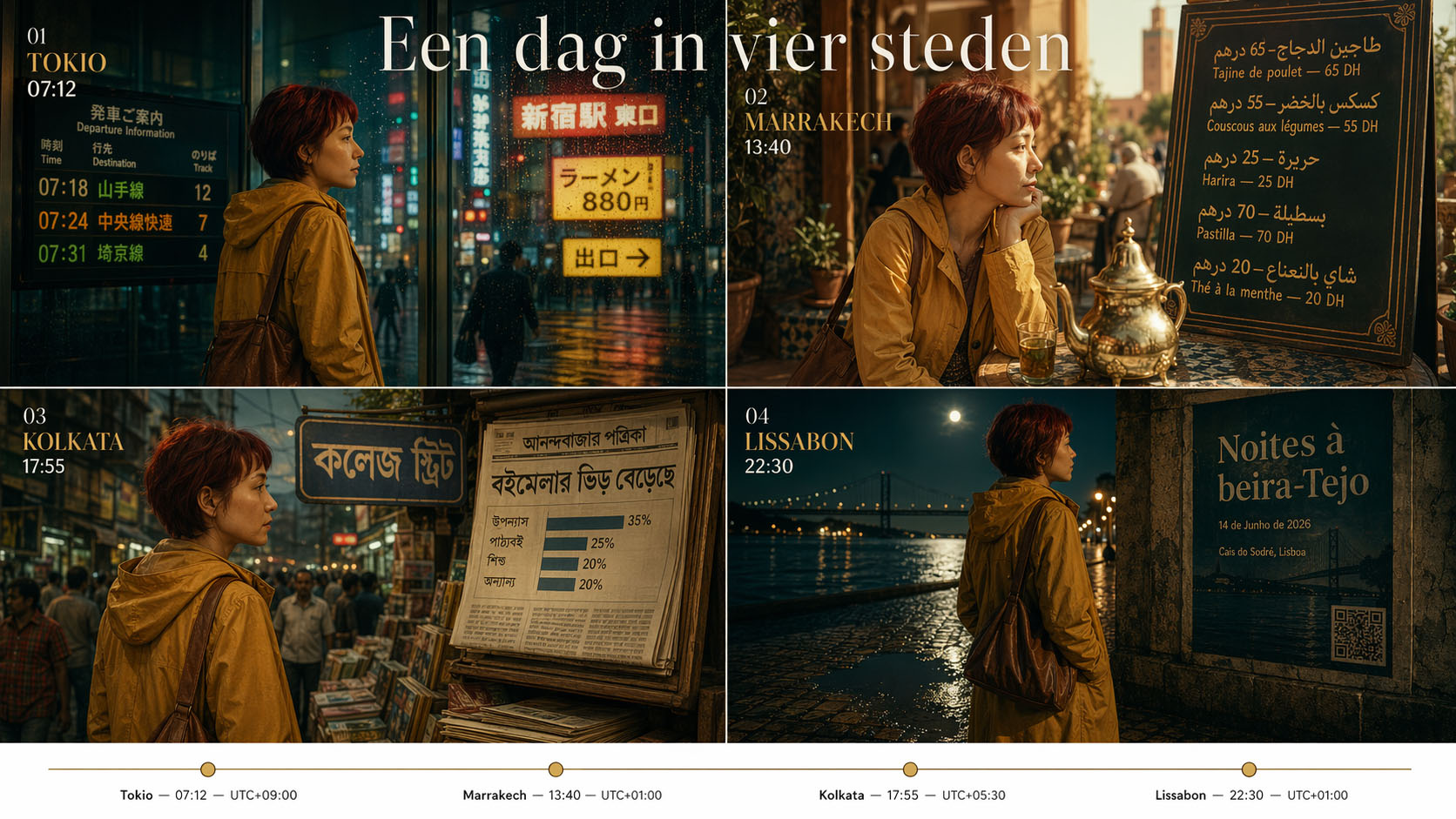 Prompt:Een vierluik (2×2 grid, 16:9, 2K) getiteld “Een dag in vier steden”, met door alle panelen heen hetzelfde hoofdpersonage: een vrouw van ongeveer 30 jaar met kort rood haar, een mosterdgele regenjas en een leren schoudertas — haar gezicht, kapsel en jas moeten in alle vier de panelen exact hetzelfde zijn. Paneel 1 — Tokio, 07:12: zij staat in station Shinjuku, regen op glas, neonreclames met leesbare Japanse kanji en katakana (“新宿駅 東口”, “ラーメン 880円”, “出口”). Een digitaal vertrekbord toont drie treinen met tijden en perrons. Filmische Wong Kar-wai-achtige belichting. Paneel 2 — Marrakech, 13:40: zij op een terras, zachte middagzon. Een handgeschilderd menubord in Arabisch schrift met vijf gerechten + prijzen in dirham, daaronder Franse vertaling. Messing theepot met correcte reflectie van de scène. Paneel 3 — Kolkata, 17:55: zij op een markt, straatbord in Bengaals schrift (“কলেজ স্ট্রিট”), een krantenstalletje met een krant waarvan de kop leesbaar is en een korte infographic (staafdiagram van 4 balken met labels en percentages die optellen tot 100%). Paneel 4 — Lissabon, 22:30: zij aan de kade, maanlicht op de Taag. Een poster aan een muur in correct Portugees met titel, datum (14 de Junho de 2026), locatie, en een QR-code in de hoek. Reflectie van haar gele jas in een plas op de kasseien. Onderaan het hele vierluik één doorlopende witte balk met een tijdlijn: vier stippen met stadsnaam + lokale tijd + UTC-offset, verbonden door een dunne lijn. Typografie: serif voor titels, sans-serif voor data. Consistent kleurpalet (mosterdgeel, diep blauwgroen, warm wit) over alle panelen.