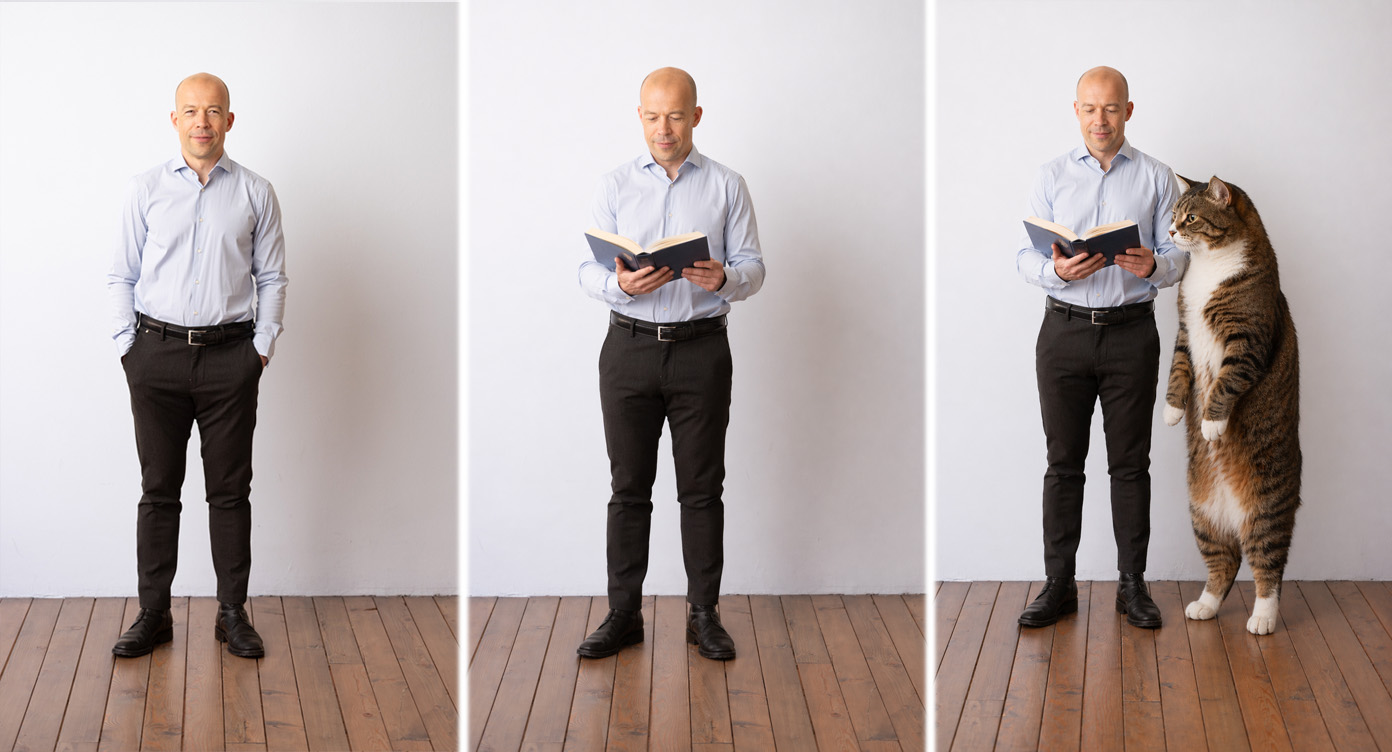Vervolgens heb ik een bestaande foto van mijzelf geüpload en gevraagd om de laptop te vervangen door een boek. Daarna heb ik in twee vervolgstappen gevraagd om een kat toe te voegen die meeleest en om die kat vervolgens even groot te maken als de man. In alle drie de beelden blijf ik herkenbaar als dezelfde persoon. Kleding, houding, kapsel, gezicht en belichting blijven over de reeks heen consistent. De scène verandert, het personage (ik) niet.