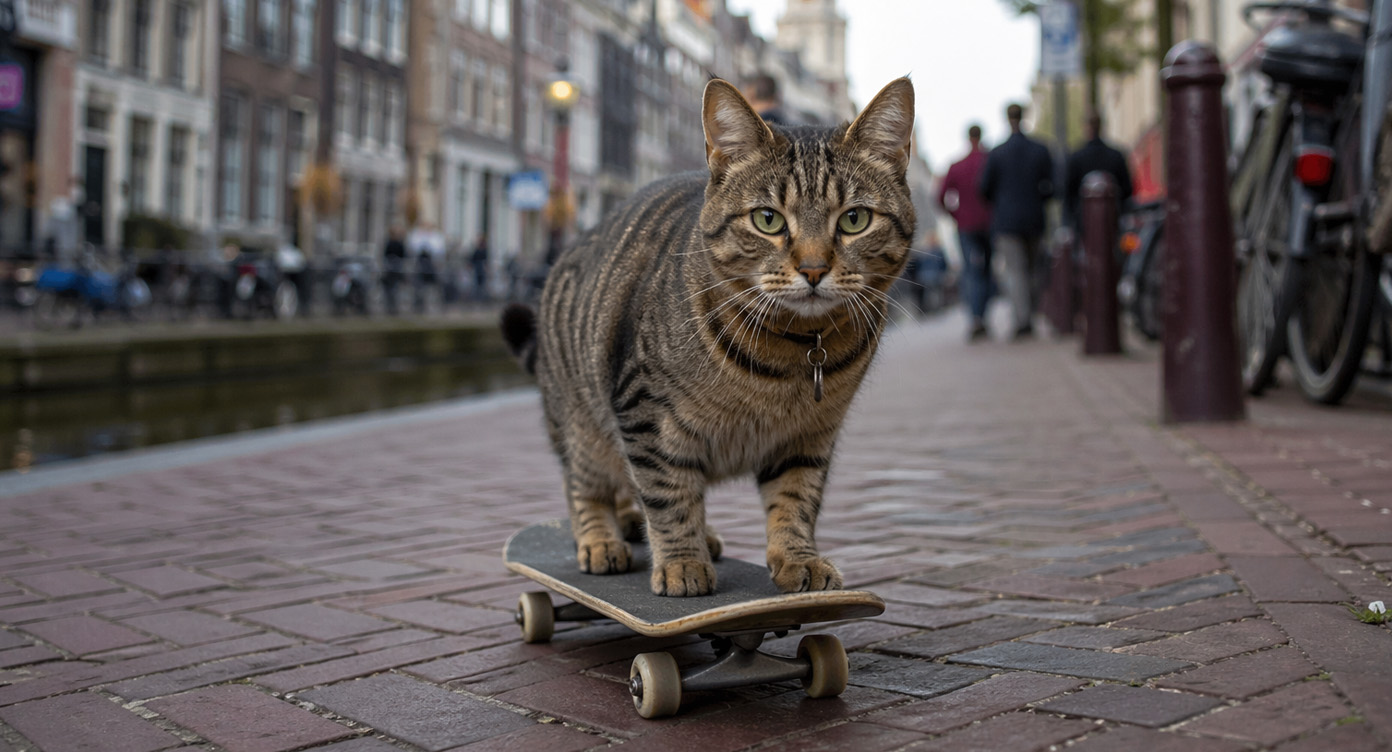 Ik vroeg om een foto van een kat op een skateboard in de Amsterdamse straten, met bokeh-effect. Het resultaat is overtuigend. De grachtenpanden, het plaveisel en het licht kloppen met wat je in Amsterdam verwacht. Ook de diepteweergave van het bokeh klopt met een reële fotografische lens. Dit is op zichzelf geen nieuwe functie, maar de scherpte en realisme zijn beter dan bij de vorige generatie.