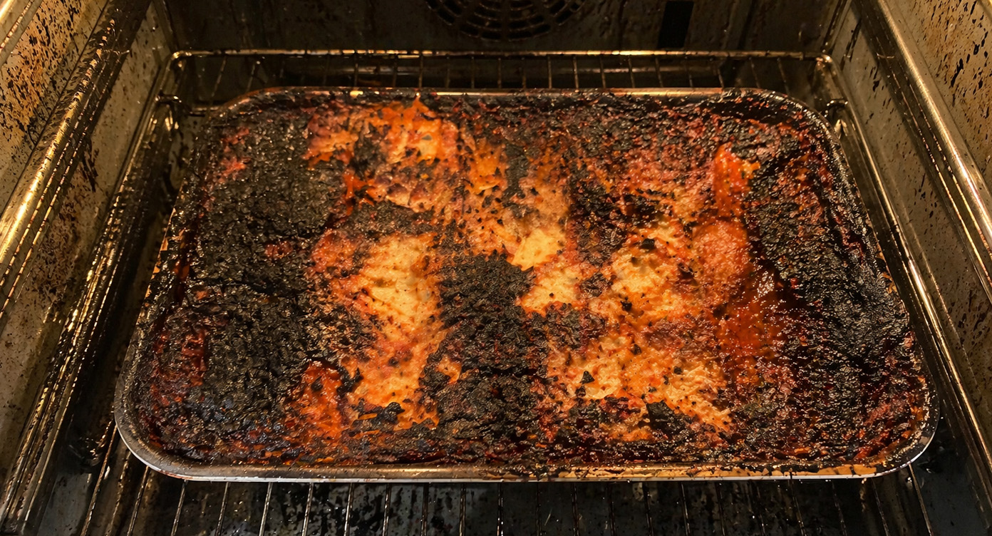 - Een lasagne die twee dagen op 250 graden in de oven heeft gestaan. Dit voorbeeld pikte ik op bij een test van een ander beeldmodel en bleek een goede manier om contextbegrip te vergelijken.